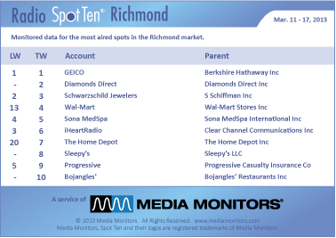 In the “Capital of the South” the #1 radio advertiser was GEICO airing 800 spots last week. DIAMONDS DIRECT was #2 with 563 spots, while SCHWARZSCHILD JEWELERS sparkled at #3 with 519 spots. WAL-MART leaped from #13 to #4 with 460 spots and SONA MEDSPA massaged their way into #5 with 401 ads. IHEARTRADIO was #6 with 289 commercials, while THE HOME DEPOT lumbered forward from #20 to #7 with 388 spots. SLEEPY’S woke-up in #8 with 353 spots and PROGRESSIVE took #9 with 351 spots. Coming in #10 was BOJANGLES’ with 337 spots.