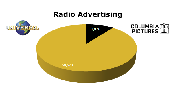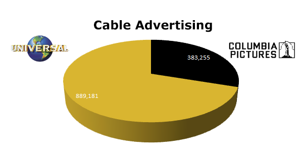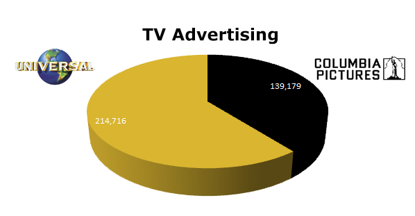 On Broadcast TV, Universal ran 214,716 spots, while Columbia aired 139,179 commercials. Universal ran the most in the month of May with 26,728 ads, while Columbia ran the most in July with 20,365 spots.