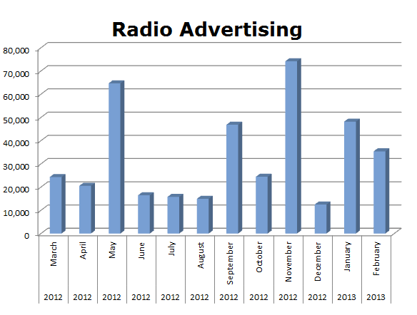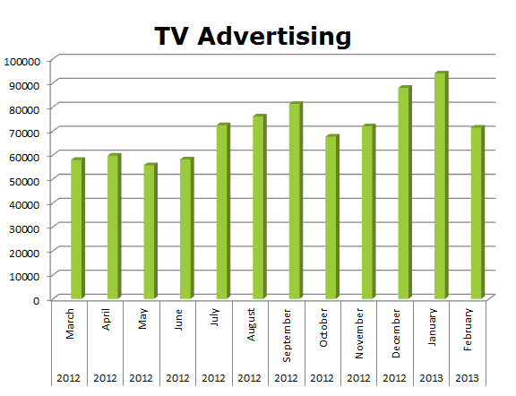 On the Radio, Fox TV ran 398,314 spots in the last 12 months. They ran hottest last November 2012 with 74,184 spots. Their other big month was May with 64,683; both to promote sweep months.
