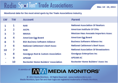 In this unique category the leader of the pack was the NAR (National Association of Realtors) with 7,436 spots. Coming in #2 was the AICPA (American Institute of CPAs) with 2,957 spots and the MHAIA (Mexican Hass Avocado Importers Association) was #3 with 1,188 spots. The AMERICAN EGG BOARD cracked into the Spot Ten at #4 with 1,056 spots, while the BSA - BUSINESS SOFTWARE ALLIANCE installed themselves at #5 with 553 spots. Corralled at #6, the NATIONAL CATTLEMEN'S BEEF ASSOCIATION with 549 commercials and the NAB (National Association of Broadcasters) moved from #10 to #7 with 399 spots. GOODGUYS ROD & CUSTOM ASSOCIATION parked at #8 with 379 commercials, while APEAM (Association to promote produce from Mexico) planted at #9 with 375 ads. The ROCHESTER HOME BUILDERS' ASSOCIATION rested at #10 with 279 spots.