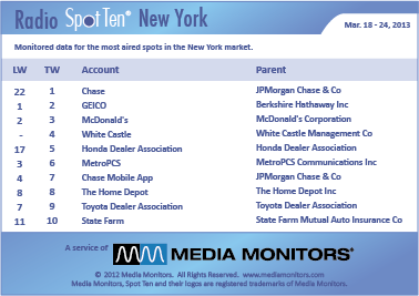 In the biggest city in America the #1 radio advertiser last week was CHASE bank with 911 spots. GEICO was #2, down from #1, with 872 commercials, while MCDONALD'S landed in #3 airing 810 commercials. WHITE CASTLE opened at #4 with 801 spots and the HONDA DEALER ASSOCIATION leaped from #17 to #5 with 740 ads. METROPCS connected at #6 with 710 spots, while the CHASE MOBILE APP took #7 with 656 spots. THE HOME DEPOT was solid at #8 with 652 spots and the TOYOTA DEALER ASSOCIATION parked at #9 with 631 spots. Coming in #10 in the Big Apple was STATE FARM with 503 spots.