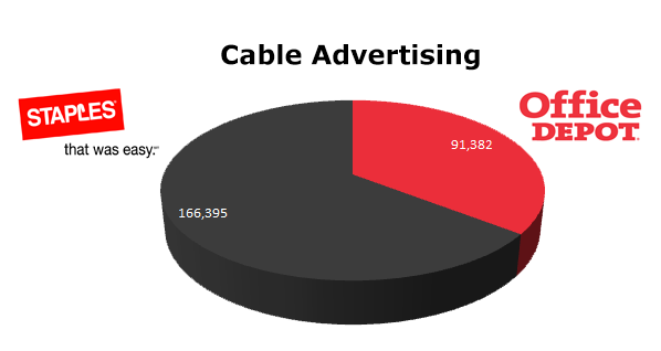 On Local Cable, Staples ran 166,395 spots in the last 12 months, as compared to Office Depot's flight of 91,382 spots in the same period. Staples biggest month was August 2012 when they ran 35,607 spots, while Office Depot was hottest in January 2013 when they cleared 44,954 ads.