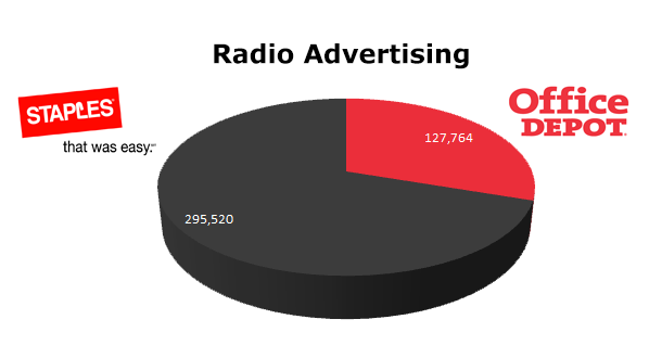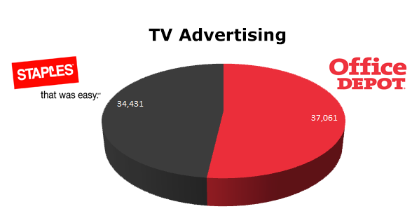 On Broadcast TV, both office supplies retailers used TV less than their other media. Staples ran 34,431 spots in the last 12 months, while Office Depot ran 37,061 spots in the same period. Office Depot ran no spots October to the end of 2012 and Staples was almost a non-advertiser in December and June 2012. Staples hottest month on TV was February 2013 with 4,502 spots and Office Depot's biggest month was August 2012 with 10,905 ads.