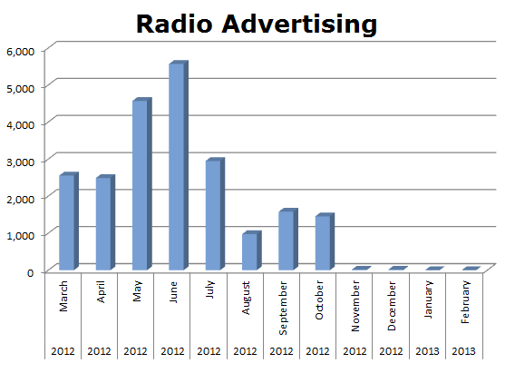 On Radio SC Johnson ran a total of 22,170 spots in the last 12 months with very few since November of 2012. Their biggest month was June when they cleared 5,567 spots.