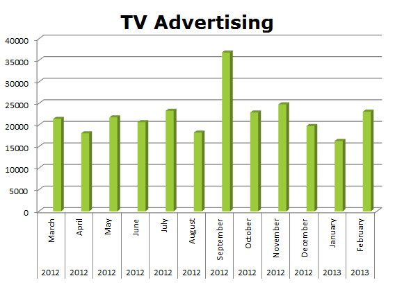 On the Radio, Staples was well out in front with 295,520 spots in the last 12 months, while Office Depot ran 127,764 spots. Staples ran the most spots in December 2012 with 53,074 spots and Office Depot cleared the most in August 2012 with 55,911 ads.