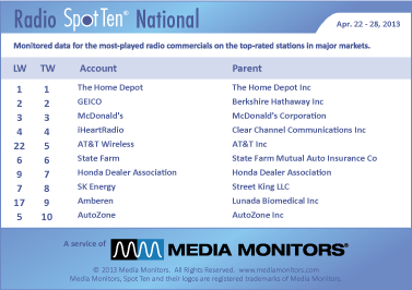 THE HOME DEPOT remains at #1 airing 62,545 spots. GEICO stays at #2 with 30,351 spots, while MCDONALD’S keeps its grip on #3 with 26,744 ads. IHEARTRADIO was solid at #4 running 23,838 spots. AT&T WIRELESS moves from #22 up to #5 with 23,811 commercials.