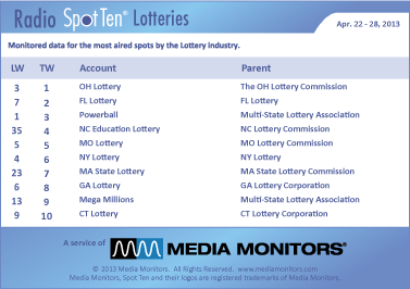 Lotteries in America* never close and the #1 lottery last week was the OHIO LOTTERY with 3,120 spots. FLORIDA LOTTERY landed at #2 with 2,315 spots, while the national POWERBALL dropped from #1 to #3 with 1,922 ads. The NORTH CAROLINA EDUCATION LOTTERY jumped #35 up to #4 with 854 spots and the MISSOURI LOTTERY was solid at #5 airing 791 spots. The NEW YORK LOTTERY hit #6 with 592 ads, while the MASSACHUESETTES LOTTERY lunged from #23 to #7 with 518 spots. The GEORGIA LOTTERY was #8 with 466 spots and the national MEGA MILLIONS moved into #9 with 440 spots. Coming in #19, the nutmeg state’s CONNECTICUT LOTTERY with 348 spots.