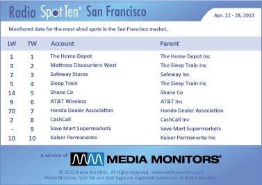#1 radio advertiser in the city by the bay was THE HOME DEPOT with 1,042 spots. MATTRESS DISCOUNTERS WEST landed at #2 airing 963 ads, while SAFEWAY STORES parked at #3 with 841 commercials. SLEEP TRAIN chugged into #4 with 790 spots and SHANE COMPANY sparkled at #5 with 738 spots. AT&T WIRELESS connected at #6 with 732 spots, while the HONDA DEALER ASSOCIATION leaped from #70 to #7 with 681 ads. CASHCALL claimed #8 with 617 spots and SAVE MART SUPERMARKETS managed #9 with 602 spots. Staying at #10 last week was KAISER PERMANENTE with 527 spots.