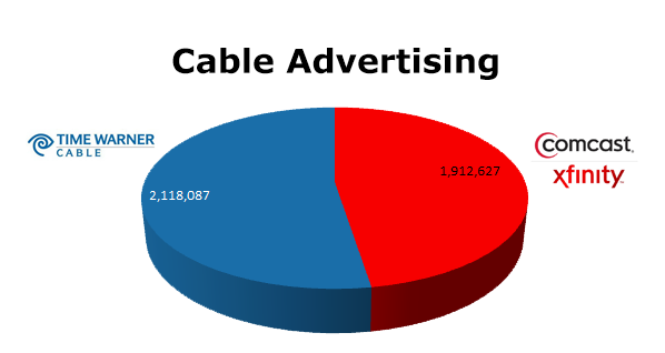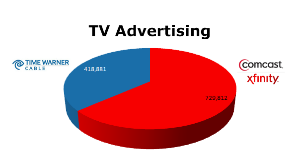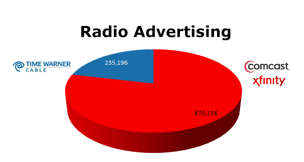 On the Radio, Comcast was way out in front with 870,158 spots in the last 12 months compared to Time Warner that ran 235,196 ads. Comcast’s biggest month was August 2012 with 83,567 spots, while Time Warner ran the most in February 2013 when they cleared 30,968 spots.