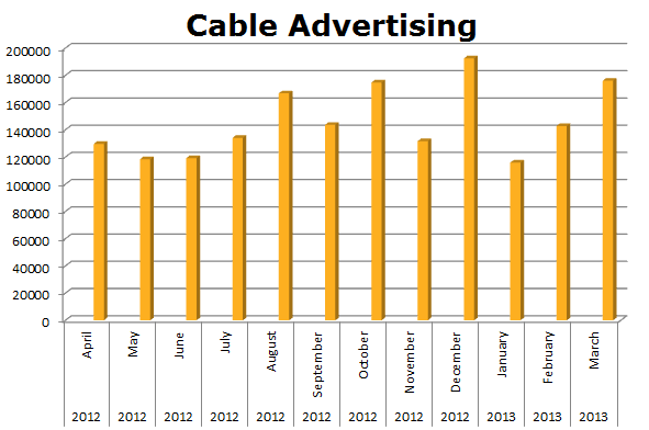 On Local Cable, both cable giants use cable to sell cable. Time Warner ran 2,118,087 spots in the last 12 months, compared to Comcast that cleared 1,912,627 ads. The biggest month for Time Warner was December with 161,696 spots, while Comcast ran the most in December 2012 as well with 196,326 spots.