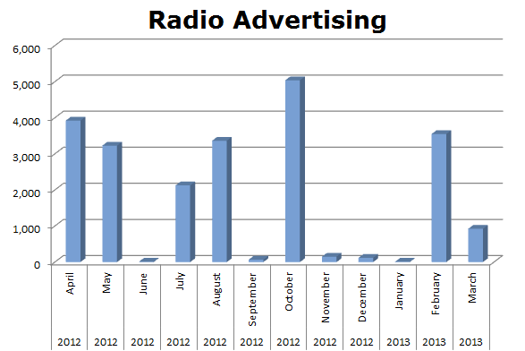 On the Radio, L'Oréal was up and down. Their total for the last 12 months was only 22,518 spots. Their biggest month was October 2012 when they ran 5,041 spots.