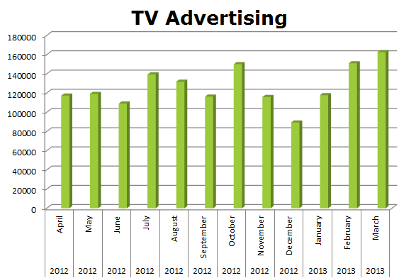 On Broadcast TV, L'Oréal ran 1,518,722 spots in the last 12 months. Last month, March 2013 was their biggest month with 162,539 spots, which bested February 2012 with 150,869 and October 2012 when they cleared 149,973 ads.