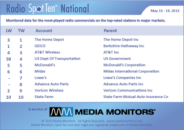 The sleeping giant has awakened once again. THE HOME DEPOT is back into #1 with 37,891 spots followed by GEICO at #2 with 33,438 spots. AT&T WIRELESS landed at #3 with 28,561 spots, while the US DEPARTMENT OF TRANSPORTATION jumped from #59 to #4 with 27,790 ads about car seats for kids and seat belts for adults. MCDONALD’S stayed at #5 with 27,321 spots.