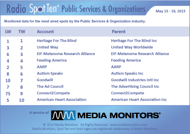 In this category we look at Public Service and Organizations that run ads on the radio. The #1 group was the HERITAGE FOR THE BLIND with 5,476 spots. The UNITED WAY took #2 with 2,799 announcements, while EIF-MELANOMA RESEARCH ALLIANCE was #3 airing 2,098 spots. FEEDING AMERICA was solid at #4 with 1,783 ads and the AARP retired at #5 with 1,572 spots. AUTISM SPEAKS was #6 with 1,566 spots and the GOOGWILL was #7 with 1,521 spots. THE AD COUNCIL captured #8 with 1,503 announcements, while CONNECT2COMPETE soared from #75 to #9 with 1,487 spots. Coming at #10 was the AMERICAN HEART ASSOCIATION with 1,464 spots.