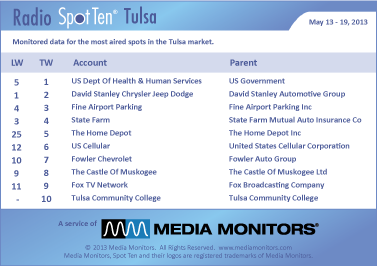 In Tulsa Town last week the #1 radio advertiser was the US DEPARTMENT OF HEALTH & HUMAN SERVICES with 436 spots. In at #2, DAVID STANLEY CHRYSLER JEEP DODGE airing 427 ads, while FINE AIRPORT PARKING slotted into #3 with 415 commercials. STATE FARM found #4 with 398 spots and THE HOME DEPOT grew from #25 to #5 with 370 spots. US CELLULAR leaped from #12 to #6 with 354 ads, while FOWLER CHEVROLET cruised into #7 with 348 spots. THE CASTLE OF MUSKOGEE moved into #8 with 347 spots and FOX TV NETWORK nestled into #9 with 334 spots. And coming in #10 was the TULSA COMMUNITY COLLEGE with 330 spots.