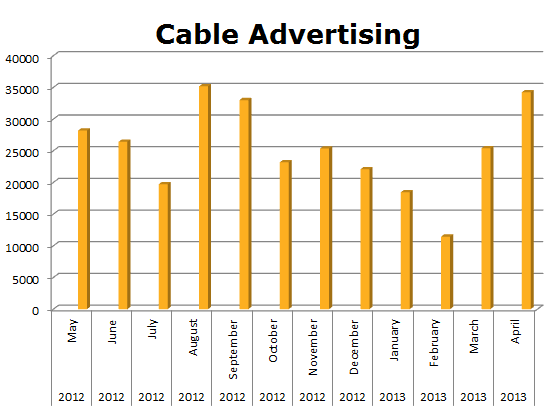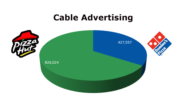 On Local Cable, Pizza Hut almost doubled Domino’s in the last 12 months. Pizza Hut ran 826,024 spots, while Domino’s Pizza cleared 427,557 ads. Domino’s biggest month was March 2013 with 46,914 spots and Pizza Hut hit their ceiling in June of 2012 with 85,695 spots.