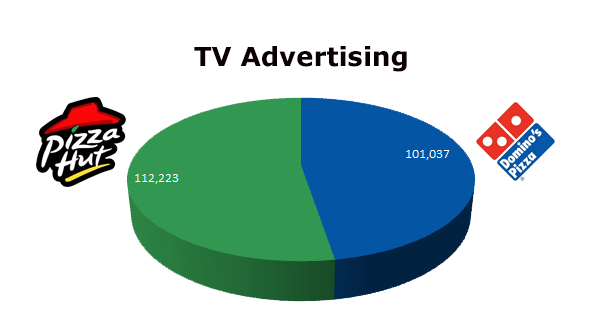 On the Radio, Domino’s ran 92,850 spots, while Pizza Hut only ran 13,281 spots in the last 12 months. Pizza Hut’s high mark was April 2013 with 1,642 spots against Domino’s largest month June 2012 when they ran 17,029 spots.