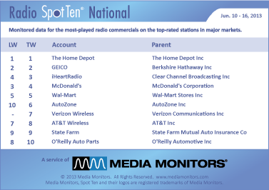 Down slightly from 57,263 spots last week, THE HOME DEPOT maintained #1 with 52,020 spots, while GEICO stayed at #2 with 34,910 ads. IHEARTRADIO was up from #4 last week to #3 with 31,754 spots and MCDONALD’S dropped from #3 to #4 with 28,091 commercials. WAL-MART held onto #5 with 27,427 spots.