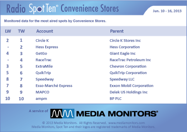 Convenience Stores are a big business in America and they use their fair share of radio to promote their goods and services. The #1 slot last week went to CIRCLE K with 1,885 spots. HESS EXPRESS settled into #2 with 1,445 ads, while GETGO jumped from #4 to #3 running 1,276 spots. RACETRAC was #4 with 1,253 spots and EXTRAMILE lost 2 places down to #5 with 1,184 ads. QUIKTRIP took #6 with 963 spots, while SPEEDWAY slipped into #7 with 696 commercials. ESSO-MARCHé EXPRESS moved from #7 to #8 with 612 spots and MAPCO held steady at #9 airing 611 ads. Coming in at #10 was AMPM with 546 spots for the week.