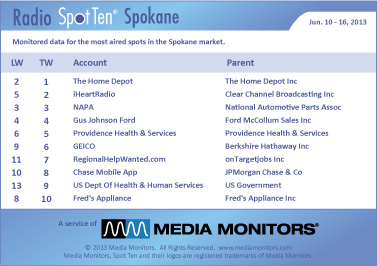 In Spokane last week, the #1 radio advertiser was THE HOME DEPOT with 647 spots. IHEARTRADIO took #2 with 525 ads, while NAPA held on to #3 with 501 spots. GUS JOHNSON FORD was solid at #4 with 482 spots and PROVIDENCE HEALTH & SERVICES jumped from #6 to #5 with 410 ads. GEICO was #6 with 405 spots and REGIONALHELPWANTED.COM rose from #11 to #7 airing 378 commercials. CHASE MOBILE APP landed at #8 with 361 spots and the US DEPT OF HEALTH & HUMAN SERVICES soared from #13 to #9 with 311 spots. FRED’S APPLIANCE entered at #10 with 298 spots.