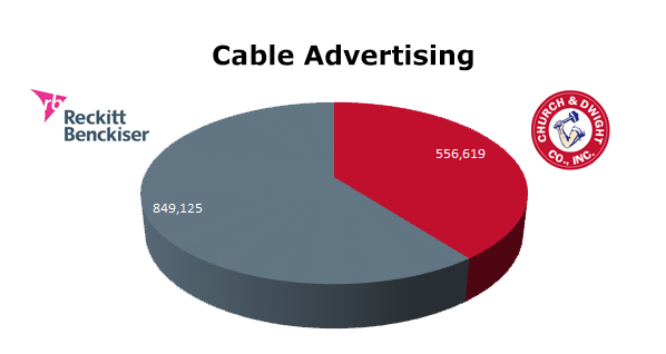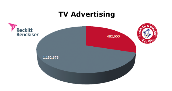 On Broadcast TV Reckitt Benckiser almost triples Church & Dwight. Reckitt Benckiser ran 1,132,675 spots, while Church & Dwight cleared 482,653 spots in the last 12 months. Reckitt Benckiser’s biggest month was October 2012 with 127,523 spots, while Church & Dwight’s biggest month was December 2012 with 58,439 spots.