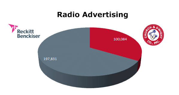 On the Radio, Reckitt Benckiser takes the lead as well with 197,831 spots against Church & Dwight’s 100,084 spots in the last 12 months. Reckitt Benckiser ran the most in July 2012 with 47,184 ads, while Church & Dwight ran the most in December 2012, when they cleared 29,622 spots.