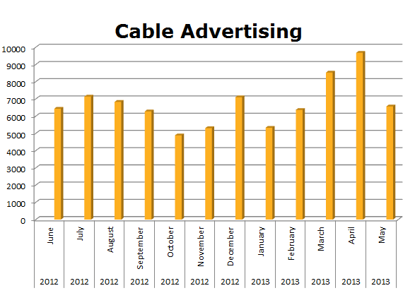 On Local Cable, Live Nation ran 80,460 spots in the last 12 months with their biggest outlay of spot coming in April 2013 when they cleared 9,682 spots.