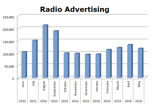 The place most people find out about new music is radio and of course, Live Nation puts the bulk of their advertising dollars in this media. In fact, 90.32% of all spots they run are heard on the Radio. In the last 12 months Live Nation ran 1,534,580 spots with their biggest month coming last August 2012 with 212,867 ads.