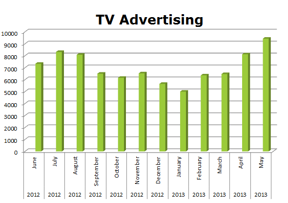 On Broadcast TV, Live Nation ran 83,943 spots with May 2013 getting the most at 9,431 spots.