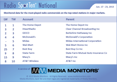 THE HOME DEPOT is #1 again with 59,831 spots. IHEARTRADIO moved up to #2 airing 39,096 announcements, while GEICO fell to #3 with 33,695 ads. MCDONALD’S was solid at #4 running 30,012 commercials and MIDAS lands at #5 with 26,296 spots.