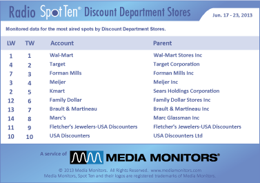 The king of the discount department stores reigns supreme at #1 with 23,267 – that’s WAL-MART. TARGET came in #2 with 3,656 ads, while FORMAN MILLS moved from #7 to #3 with 764 spots. MEIJER was in at #4 with 383 spots and KMART captured #5 with 300 spots. FAMILY DOLLAR jumped from #12 to #6 with 225 ads. BRAULT & MARTINEAU was #7 with 174 ads, while MARC’S hit #8 with 157 spots. FLETCHER’S JEWELERS – USA DISCOUNTERS hit #9 with 156 spots and USA DISCOUNTERS stayed at #10 running 154 spots.