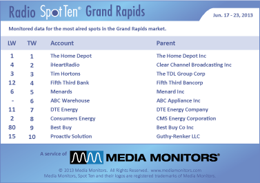 In Grand Rapids last week, the #1 radio advertiser was THE HOME DEPOT with 721 spots. IHEARTRADIO was #2 airing 695 announcements, while TIM HORTONS was steady at #3 running 570 ads. FIFTH THIRD BANK leaped from #12 to #4 with 440 spots and MENARDS captured #5 with 420 spots. ABC WAREHOUSE appears at #6 with 371 ads, while DTE ENERGY lit up #7 with 358 spots. CONSUMERS ENERGY dropped from #2 to #8 airing 338 commercials and BEST BUY bounced from #80 up to #9 with 336 spots. PROACTIV SOLUTION slid into #10 with 311 spots.
