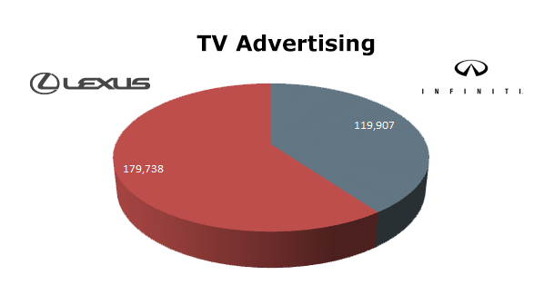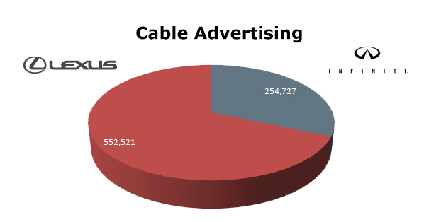 On Broadcast TV Lexus ran 179,738 spots in the last 12 months, while Infiniti aired 119,907 commercials. Lexus ran the most spots in August 2012 with 19,647 and also in December 2012 with 19,918 ads. Infiniti hit their high water mark in August 2012 with 17,270 spots.