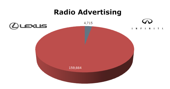 Lexus is more radio than Infiniti, which only ran 2.95% as many spots as Lexus. Lexus ran 159,664 spots in the last 12 months, while Infiniti ran only 4,715 ads. Lexus biggest radio month was September 2012 with 26,139 spots and Infiniti hit their high in March 2013 with 1,747 spots.