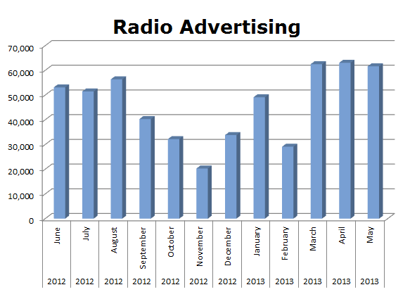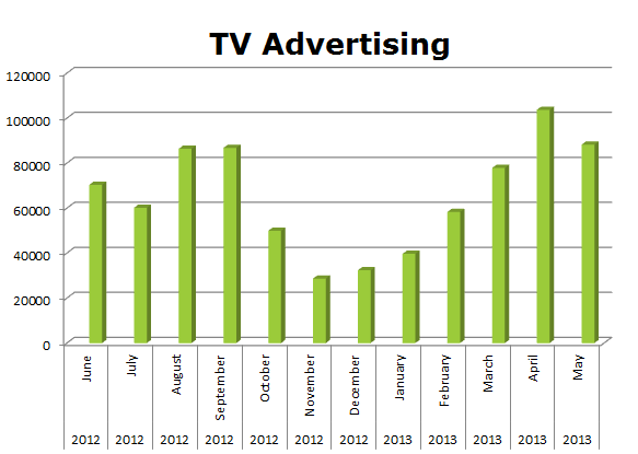 On the Radio, Chattem cleared 553,006 spots in the last 12 months with three big months of March 2013 – 62,498; April 2013 – 63,061 and May 2013 with 61,643 ads.